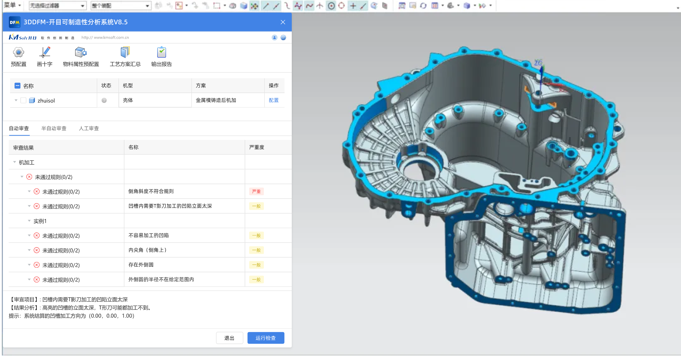 針對高端制造業普遍面臨的研發周期壓力,開目3DDFM 8.0通過智能算法升級,將復雜裝配體處理效率方面提升30%以上。開目公司通過對制造特征識別算法的優化,顯著提升了關聯面數據的讀取與過濾速度,提高了零件厚度的計算效率。同時,在裝配審核環節,通過算法優化,有效減少了審核過程中的資源浪費,提升了審查效率,為用戶打造了更加高效、可靠的制造性審查分析軟件。