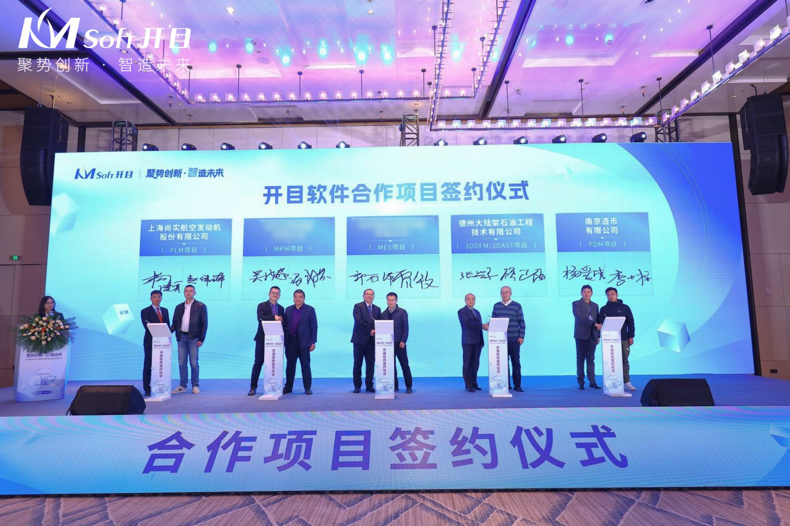 會上,在各位來賓的共同見證下,開目軟件分別與上海尚實航空發動機股份有限公司、航空工業集團某公司、中國船舶集團某公司、德州大陸架石油工程技術有限公司、南京造幣有限公司簽訂數字化建設的項目合作協議,在開目的助力下,各企業積極探索數字化研發、數字化工藝、數字化制造等的應用實施,雙方將優勢互補、齊心協力,加快推動各企業數字化轉型戰略落地。