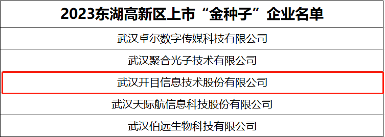 近日,2023年武漢市東湖高新區上市“金種子”、“銀種子”企業名單正式發布。經企業申報、材料審核、專家評審等一系列嚴格的審查程序,武漢開目信息技術股份有限公司作為重點上市后備梯隊,成功入選“金種子”企業名單。