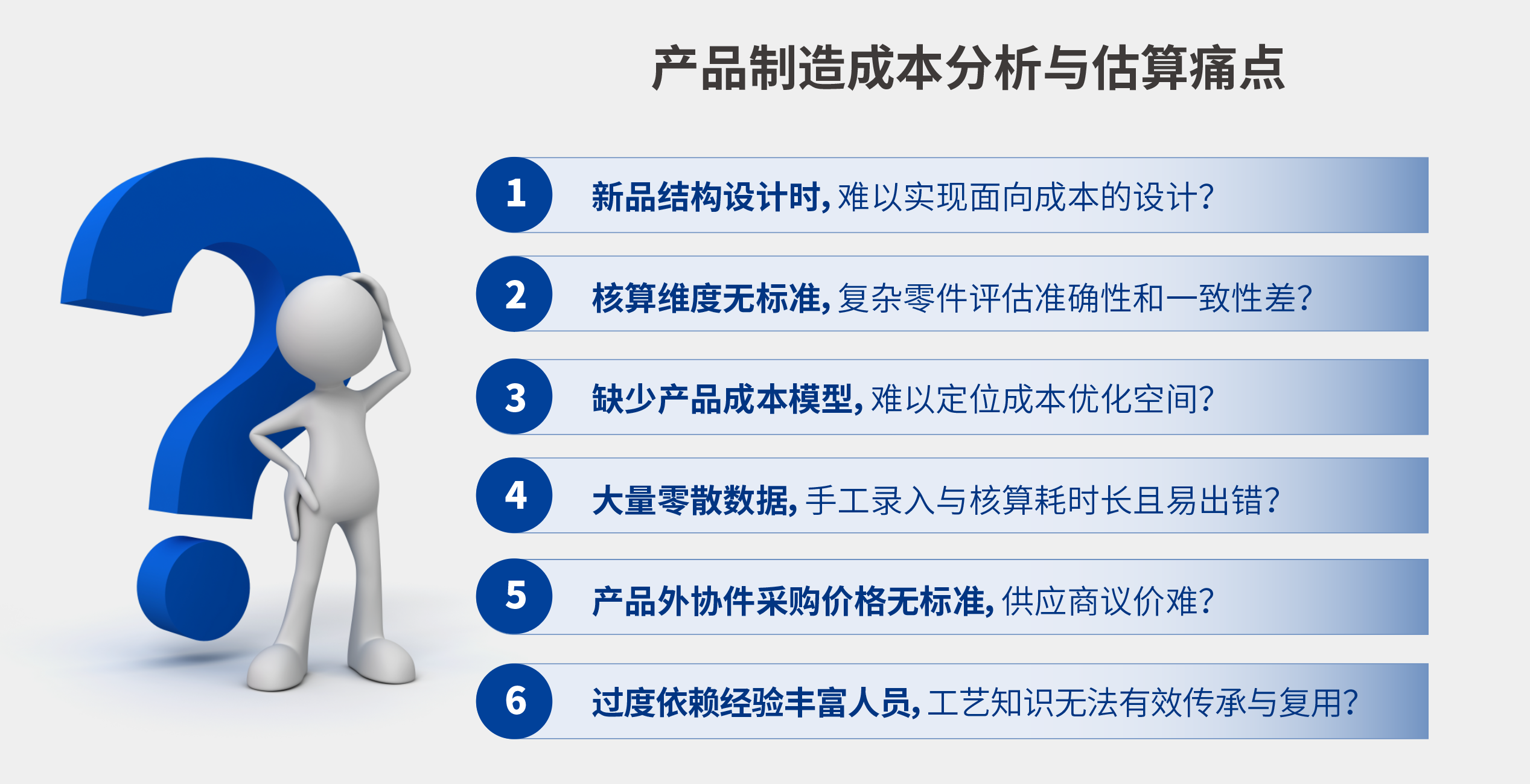 隨著科技的不斷進步和全球化市場的發(fā)展,推進數字化轉型、服務產品升級、提高經營效率、降低生產成本成為裝備制造企業(yè)贏得競爭的關鍵。而產品的成本貫穿整個產品生命周期,研究表明,70%-80%的成本在研發(fā)階段就已經確定,因此裝備制造企業(yè)普遍尋求應用數字化手段來降低產品成本,從而提高產品的競爭力。但企業(yè)在產品的成本控制和降本方法上,常常會面臨以下問題: