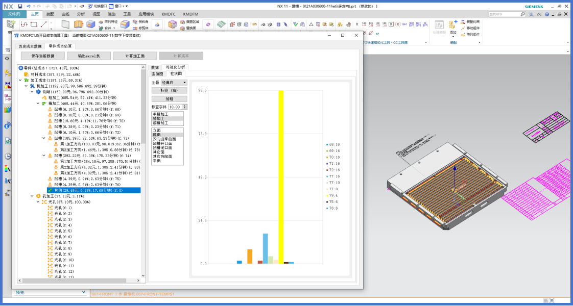? 先進的成本評估模型:3DDFC結合開目自主研制的特征識別技術和工藝知識表達技術,根據企業(yè)特定制造要素配置成本數據,實現(xiàn)基于MBD模型和工藝知識庫,遵循工藝原則,不依賴詳細工藝路線,在設計階段完成成本分析與估算。